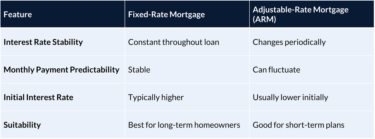 The main alternative to a fixed-rate mortgage is an adjustable-rate mortgage (ARM), which features a variable interest rate that can change periodically based on market conditions. Here are some key comparisons: